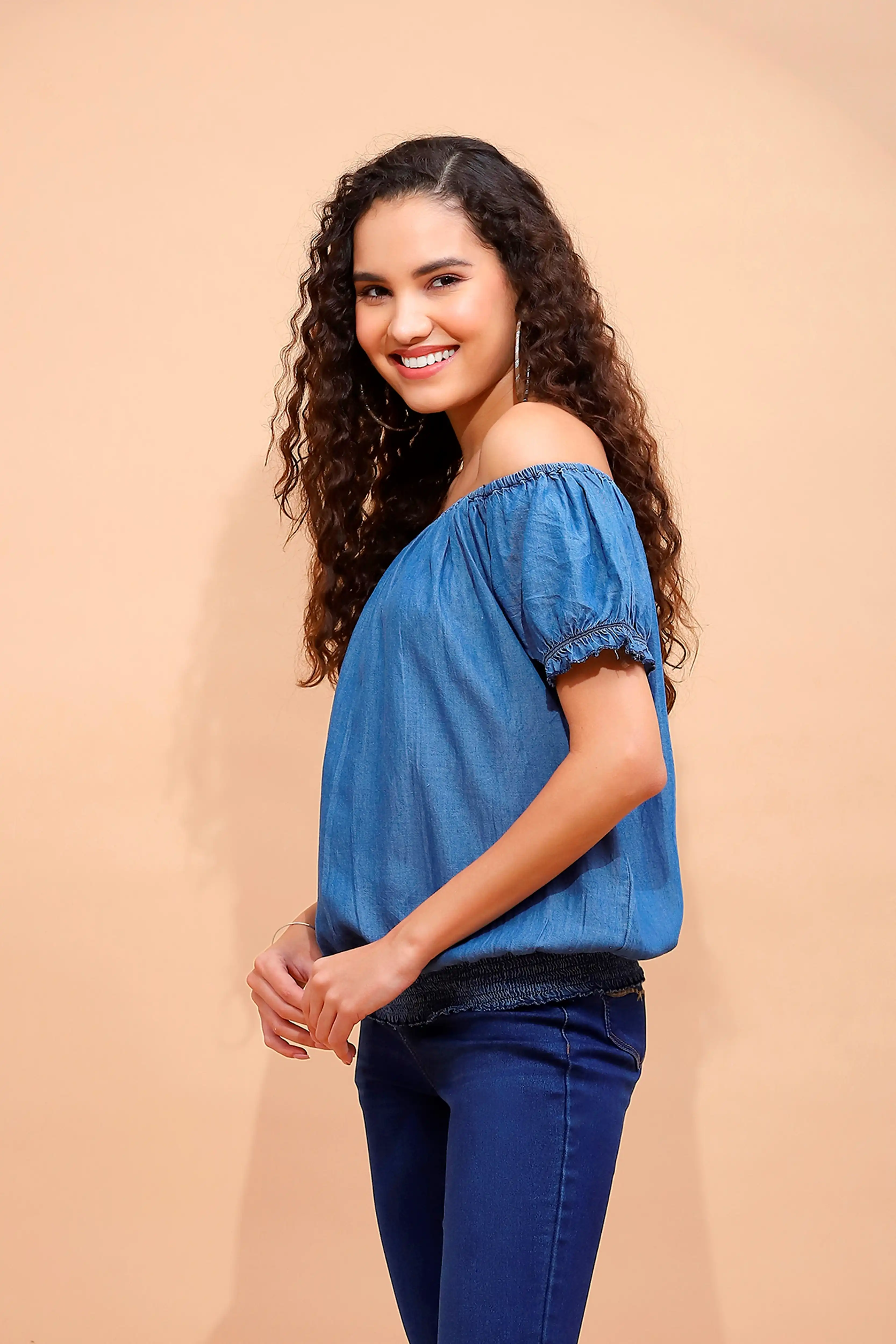 This top is a stylish off-shoulder piece crafted in a vibrant blue fabric that gives it a fresh and breezy look. It features an elasticized neckline that sits comfortably across the shoulders, creating a feminine and relaxed silhouette. The short sleeves are gently puffed and finished with elastic ruffled hems, adding a soft, playful touch. The bottom hem is also gathered with smocking, giving the top a slightly blousy shape that pairs well with fitted jeans or skirts. Overall, itβs a chic and comfortable choice perfect for casual outings, summer days, or laid-back gatherings.
