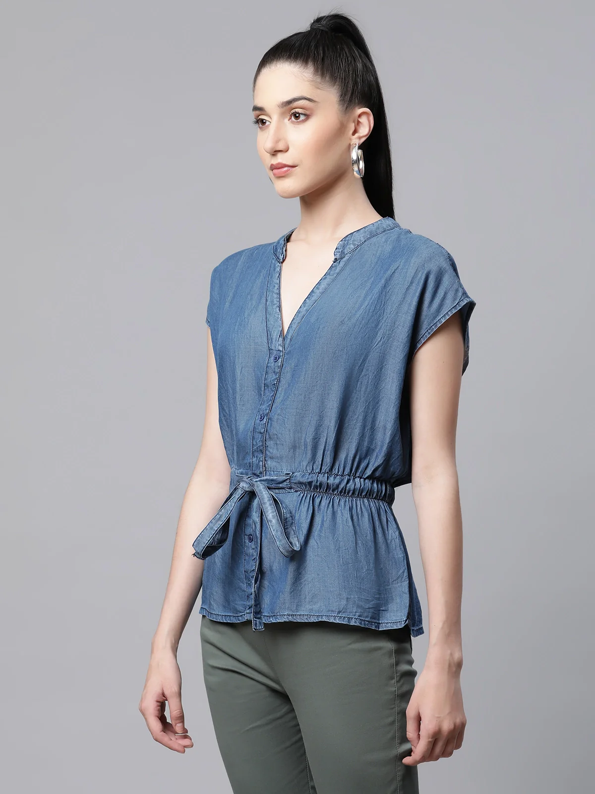 Discover the Stylish Comfort of Our Blue Denim Regular Fit Blouson Top