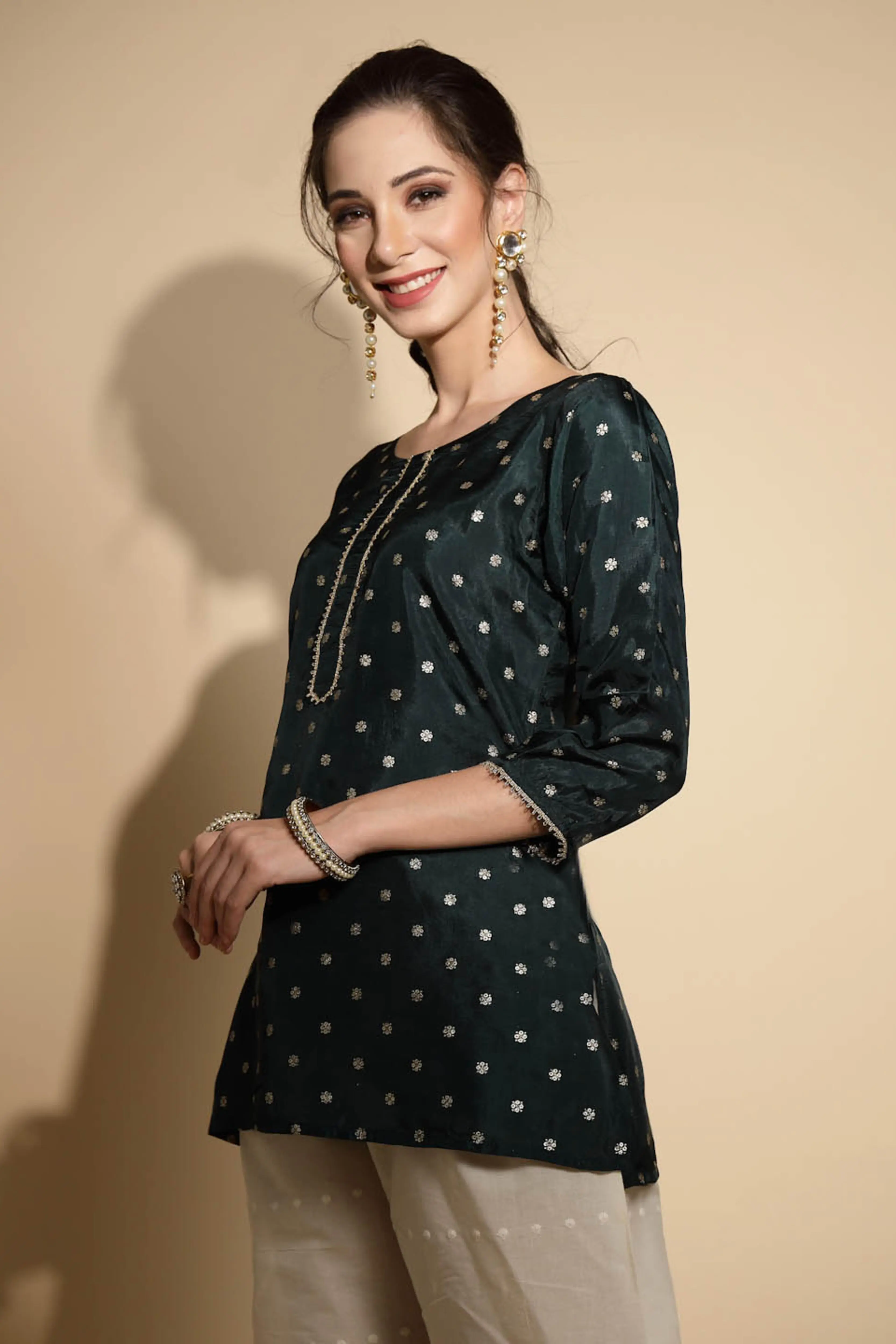 Dazzle the scene, with this cute Green Tunic. With amazingly appealing embroidery and prints on the suiting round neck composition of the Tunic. With the comfort of the three quarter length sleeves and a cute round neck, this tunic is Eveready to rock all your outfits!