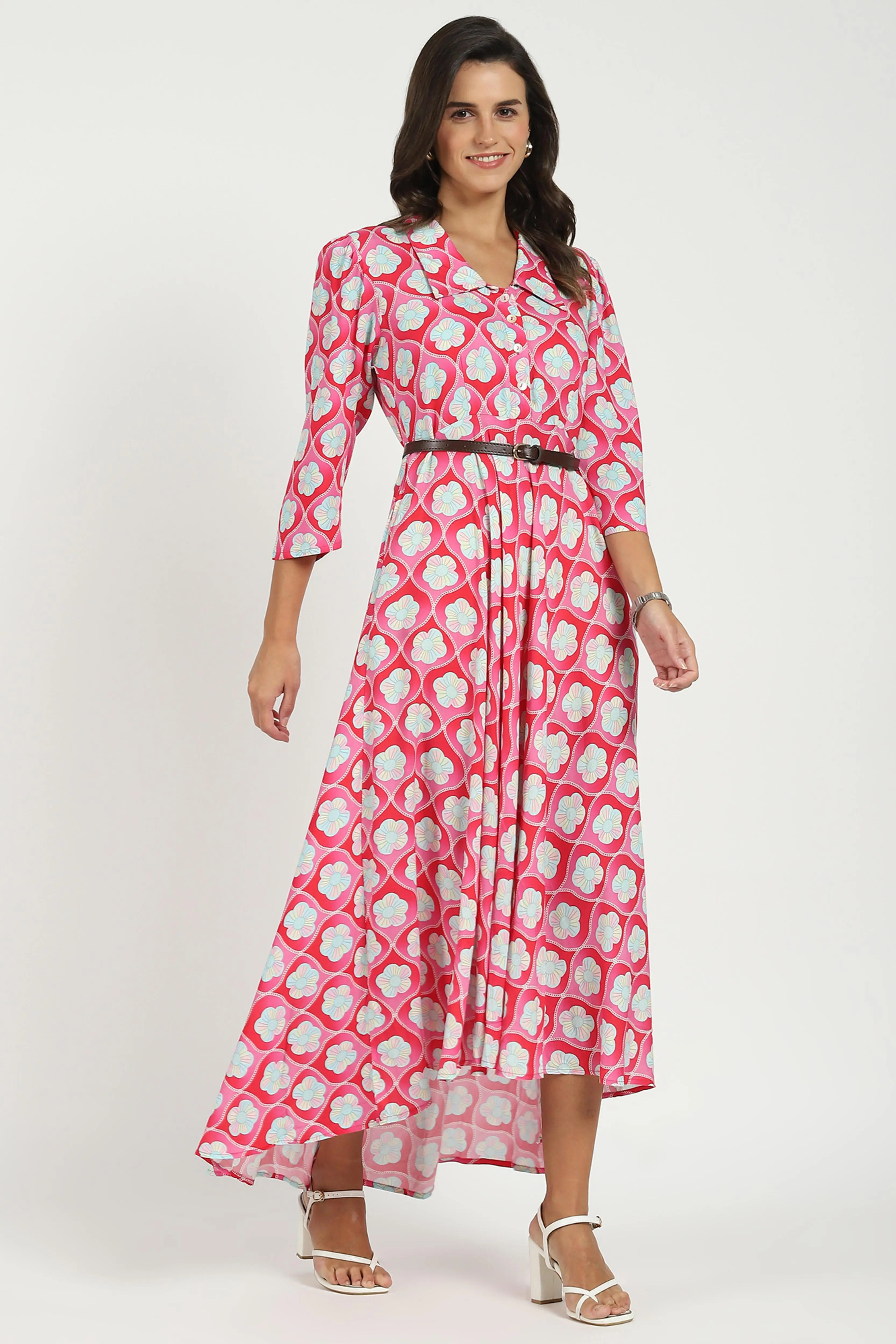 The ME & I Rayon Regular Full Length Fit & Flare Dress is the ultimate summer look. Featuring an overall floral print design, this dress will add a splash of color and freshness to your closet. The half-button front closure and 3/4 sleeves provide a stylish yet relaxed feel, while the collar neck adds a touch of sophistication. With its complimentary fit & flare design and its own detachable belt to tighten your waist, this dress is ideal for every occasion.