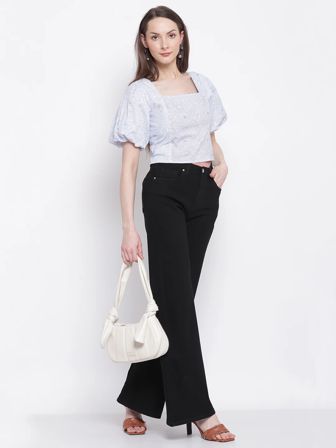 This elegant top is designed with a structured square neckline that lends a modern yet timeless appeal. The voluminous puff sleeves add a touch of drama and femininity, balancing beautifully with the clean, fitted bodice. Crafted from textured fabric with intricate detailing, it offers visual interest while remaining lightweight and comfortable. The cropped length makes it ideal for pairing with high-waisted bottoms, creating a flattering and stylish silhouette suitable for both casual and semi-dressy occasions.